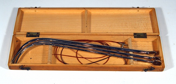 Description: 11.75×3×1 oak box contains three nickle plated or possibly steel sounds each with a screw tip to which a filigree can be screwed to guide it through the urethra, filigrees are present also.