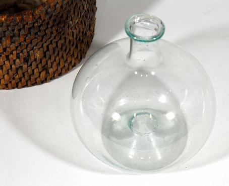 Description: 3.5” high x 4.5” wide clear glass flask with 1.5” lipped neck and a very deep pontil mark on the base protruding into the flask. It sits in a woven basket and on a bed of cotton that has been added for protection. Although a person could not urinate directly into this flask, it is likely a urinal was used and the urine poured into the flask for observation. Few of these have survived but this one was authenticated by Elizabeth Bennion, a world renowned authority on medical antiques. One of the images shows the large pontil mark that is characteristic of hand blown glass. The rim also shows some of the irregularity that would be expected with a hand blown process. The photo of the 18th century folio size print, also shown, reflects the use of the flask. The patient would urinate into a container and the urine would be transferred to the flask. The uroscopist would then examine it for color, clarity, smell and taste. Based on these observations a diagnosis would be made. See the reference for a contemporary account of the use of this technique of physical diagnosis.