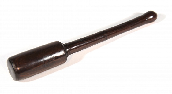 Description: 1“dx3” wieghted head on 6.5” x 0.75” handle. All of mahogany. These hammer like devices were used to tap the bleeder to pierce the skin when non-mechanical type was used. A fancy one made of ivory is on the site.