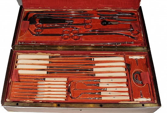 Description: 20.25“x 8.5“x 6.25” walnut chest, escutcheon le Dr. Martin Saint Ange, bound in brass with brass handles on ends. Four layers, top lid :7 pieces, two tourniquets one wooden, one multipiece C clamp ,forceps, needles missing 2 syringes and set of catheters. All of case bound in red velvet. Top layer of lid 14 pieces, 4 cautery, 5 various forceps, trocar, 2 scissors, 3 extractors, file in hidden compartment one empty. Bottom layer has 12 pieces: 1 scissor, 1 tourniquet, 3 forceps, two amputation saws, 3 smaller forceps, one elevator. Top Layer has 25 pieces: 19 various knives, and retractors, one giglie saw, one probe, 1 forceps. This extensive set includes 25 pieces with ivory handles, each cross hatched and with the initials of the owner MSAin highly stylized writing. It is one of the most extensive and exquisite capital operating sets I have encountered. The reference is to a publication by the original owner Martin St Ange who was an embryologist..This is undoubtedly a presentation set for graduation from medical school. The manufacturer is said to have made sets for the personal physician of Napolean Bonaparte.