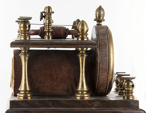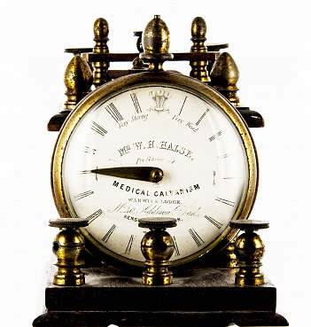 Description: 5“x 2.5” electric coil mounted on a 7“x 4” base. Distinctive is the 4” circular face with a pointer which turns to indicate a changing charge as the coil is extended. 8 lacquered brass fittings. Associated electrodes missing. This is a rather elegant example of a typical nineteenth-twentieth century electric shock machine used to treat a vast variety of ills. The Science Museum has a an interesting example of a trade card advertising this device.