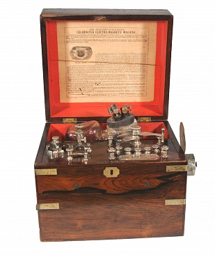 Description: 11“x 9.5“x 9” mahogany box with brass corners, escutcheon and drawer on one side. Label with directions on lid, ornate glass wet cell battery, which is turned on by tipping it. Multiple patent dates. Rheostat, posts and current adjuster. Battery can be removed on stand, coil is hidden. Drawer contains instruction book, wires, 3 handles, 2 of wood and metal, metal plates. Extremely ornate set.