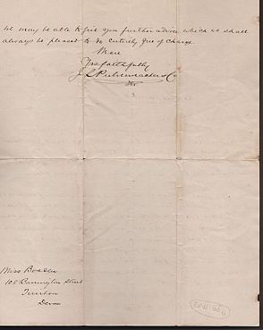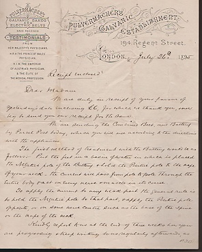 Description: Black case 9“x 5“x 2” contains gold colored chain which is 18” long (2) each chain contains 51 tubular cells which are copper batteries. Separate compartment contains two wooden handled brass tubes 5” inside of which sponges can be inserted. The sponges and two electric wire connectors are also present for direct application to an affected part. Label in top Miss M.A. Boaden. This was acquired with the letter from the company conveying the instrument. The front and back of the transmittal letter are shown in the views that can be selected from the side. The belief in the curative powers of electricity dates back to the 18th century when machines to generate electric currents first became available. The devices deliver a very low voltage current to treat the ailment of the time.