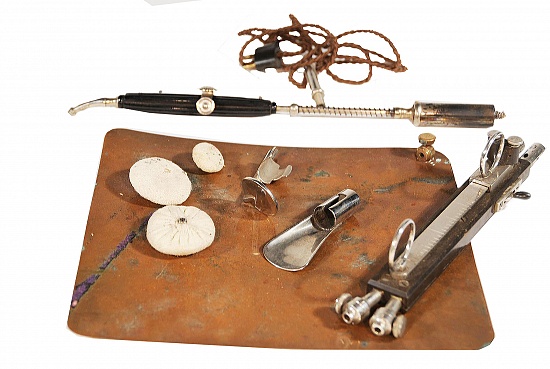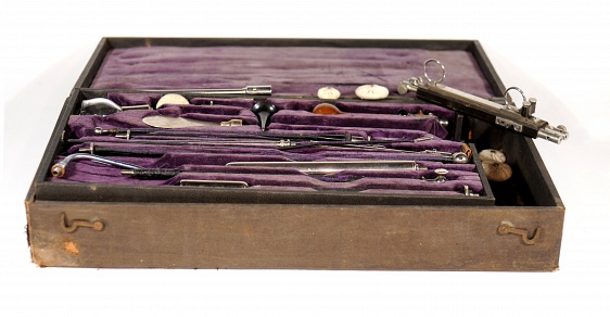 Description: 16“x 8“x 3” purple velvet lined box with two layers contains 16 electrodes for eye, gu and various other orifices in top layer, diagnostic pieces in bottom layer and a grounding plate and 5 cloth sponges and a cautery handle in side compartment.