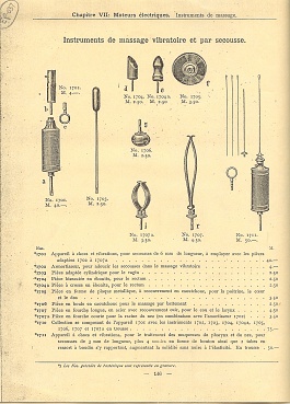 Description: 10.75“x 5“x 2” cloth covered box containing 9 instruments and key. The pieces are very attractive with the main piece being covered in red leather. Contains devices for different types of massage, which are identified in the accompanying piece of ephemera. The description shown here is from their catalogue dated 1898. The catalogue is in French, but the catalogue comes from Erlangen, which is in Germany. The