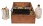 Description: 9.5“x 8“x 7.5” oak box with coil housed in a wooden platform 6.5“x 2.5“x 2” with 6 posts, plate with patent dates. Coil lifts on platform to reveal compartment for accessories. The battery is a Beaker 4“x 3” d with the metal plates held by a brass clamp to insert when full. A glass bottle in a second compartment holds the acid.