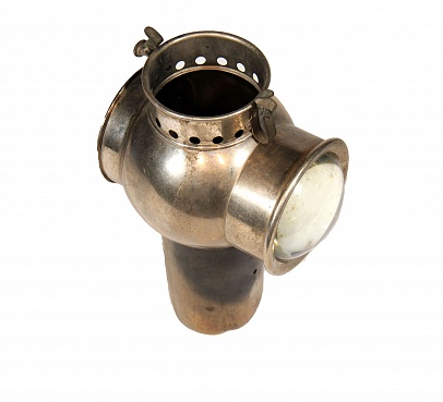 Description: 7“x 2.25” white metal cylinder, which serves as a chimney with top stained by smoke and bottom with small holes around circumference and clip to attach to light source. 1” from bottom is a 3“x 4” cylinder at right angles which is closed at one end and at other end has a convex lens. Probably used for ENT examinations.