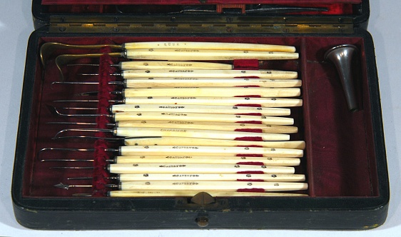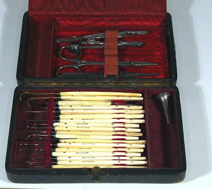 Description: 7.25×4.5×1.25” red silk lined case. Bottom contains 18 ivory handled ophtalmologic knives, all but two original. Also 1.5” silver ear speculum. Top opens to reveal two forceps, eyelid retractor and clamp. Plate holding these lifts out to reveal some suture material. Several pieces missing from small side compartments. Dr. F. Paquet, Routaix inscribed on top of case.