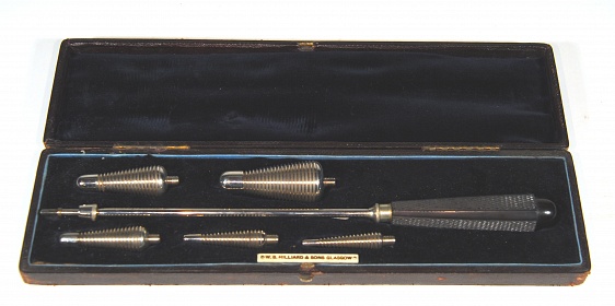 Description: 12 .75“x 3.30“x 1 1/8” red leatherette box contains 11.75” handle, which is part steel with grip of checkered ebony. Five bougies which screw on to end of handle are present of various sizes. Dr. W.L. Reid’s Pattern. A crude but effective therapy.