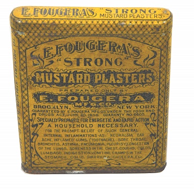 Description: 5” x 4” x 0.5” yellow tin with label stating directions and claiming for the prompt relief of such general internal inflammations as: neuralgia, ear ache, inflamed gums, toothache, sore throat, bronchitis, etc…. Contains 5 original plasters each 4.5“x 3.5” with label and directions warranted to contain pure mustard.