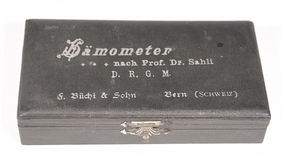 Description: 6.5“x 3.25“x 1.5” black box labled in white print: Haemometer, nach Prof. Dr. Sahli D.R.G.M. with mnfr.5 3/8× 1 1/8x .5” black thermoplastic stand with two slots, for 1/4” tubes, one with a liquid (colored) and the other hand calibrated to 140. There is a translucent backing, case also contains pipette. One 20 cm, the other unlabeled. Tubing with ivory mouthpiece and tube of fluid in screw top case.