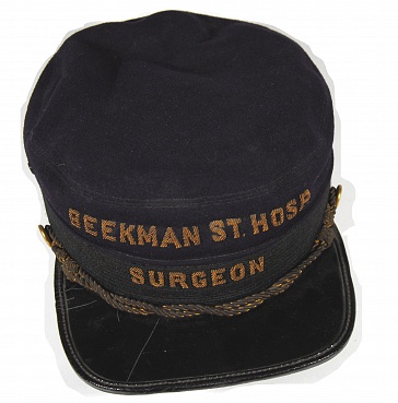 Description: 10“x 7” blue cap, which is labeled over the visa Beekman St. Hosp. surgeon. The cap is similar to the civil war style caps used by the army. Inside the name Dr. Westenberger is written. The hand writing appears to be an older style but that could be a name other than the original owner.