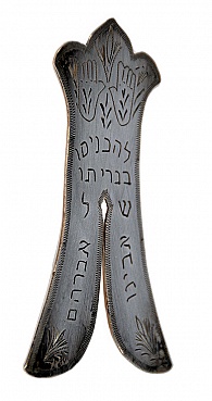 Description: Ritual silver circumcision clamp (also called a Barzel). 4.5“x 3 “, with inscriptions of the ritual jewish prayer and the upheld hand. The clamp has a slit in the middle for the foreskin and it is bell shaped. Some inscribed decoration as well as the prayers.