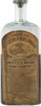 8 1/4“x 3 1/4“x 1 3/4” molded bottle embossed Arthurs elixir of sulphur positively cures all throat and lung diseases and catarrh. Lable has emblem with picture of erupting volcano.