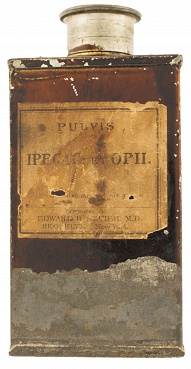 Description: Three corked tins with paper label and contents. All three are labelled prepared by Edward R. Squibb, Brooklyn, NY. Squibb was a major supplier during the American civil war. A main distribution center for the war was located nearby in Astoria, Queens. Squibb began in 1858 at 149 Furman Street in Brooklyn, NY. The product label changed to E.R. Squibb and Sons in 1892. Many army medical chests contain this type of tin.The largest tin is 4 1/8” high and 2” square. It is labelled:Pulvis Ippcac Et Op11. Under the title it appears to read: pills, containing each five grams. A second tin still has its paper seal and is labelled: Extractum O-Ihici Se-Ini Elitidium. Under the label it reads “each minum represents one gram of colcicinum and then the pharmaceutical quantity. It is 4 3/4” high and 1 1/2” square. The third is labelled Pilulae. Hydragyri and it is 4” high and 1 1/2” squ are. This is the best preserved label. The labels can be read by clicking the magnify button and moving over them.
