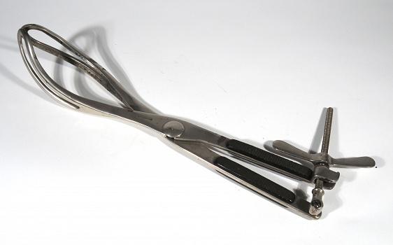 Description: 16” steel forceps with straight arms which are covered with checkered ebony. Tthe arms are joined by a u and rivet. At the very end of the handle there is a rotating screw which can be swung across to the other handle to lock it with a large wing nut.