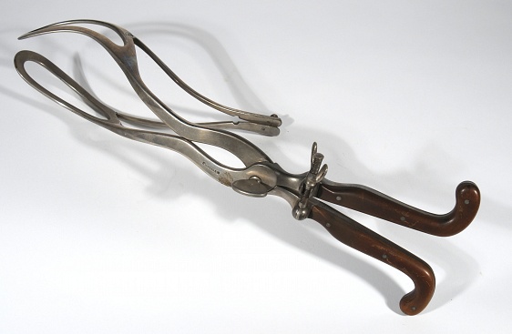 Description: 16.5” steel forceps with curved composition covered handles. The handles are joined by a screw and u and there is another pivoting screw across the handle at the base to lock the two arms together. The head grasping end has a gentle curve and there are rods pivoted from each to extend down and lock together (piece missing) to apply traction.