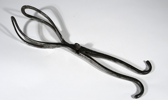 Description: 15 steel forceps joined with a locking screw, end in two curves for grip, head has gentle, long 6’ curve with narrow fenestration width is 1 3/4 at widest.