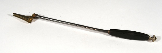Description: 11” with wooden handle and 1.75” brass speculum at end. The speculum is opened by turning a circular wheel at the far end of the handle.