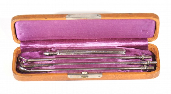 Description: Nickle plated handle and three currette attachments all with hole through center to allow fluid to flow. Handle is 4” and attachments are 6.25”. All contained in a leatherette covered box, 7“x 1“x 1.75.” Labeled Set of 3 Rinsing Curettes. Nickle plating became common after sterilization techniques were established.