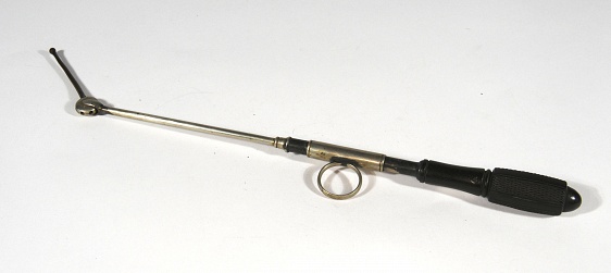 Description: 10.5” with 4” checkered ebony handle, 7.5” silver plated arm, ends in a 0.5” circle with a 2.25” projecting sound. There is a finger loop on the proximal end of the arm. There are multiple holes in the circular wheel. By pulling back on the finger look, a catch on the wheel is released and the angle of the sound can be adjusted.