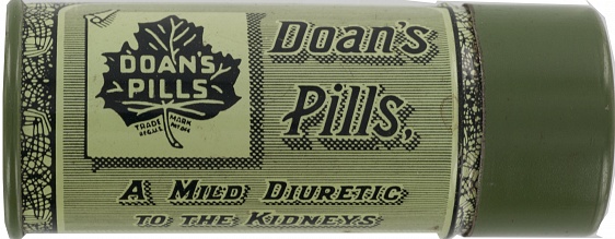 Description: Two examples of Doan’s Pills, one in a wooden container ( 2.5” x 1 1/8”) and the other, a later one in a metal container (2.5” x 1”). The label on the wooden container has a statement “These pills do not act on the bowels, when a laxative is required use doan’s reculets, a free sample of which is in this packate”. Both labels are signed Jos Doan. The product is mentioned in the AMA Nostrums and Quackery publication (ref 68, 69). . They are still produced today under a different name.
