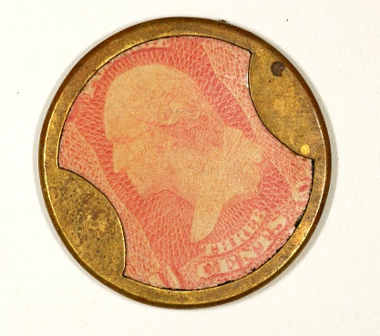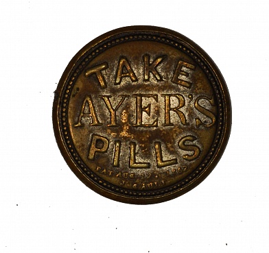 Description: Encased postage stamp, three cent, reverse take Ayers pills. Stamp encased in a metal frame behind a shield of transparent mica. Used as small change during the civil war. The encased stamp was invented by John Gault . The stamp was protected by the metal on one side and a layer of mica on the other. By encasing the stamp he prevented the wear and tear that a free stamp would be subjected to. These tokens were used as legal currency for the face value of the stamp.