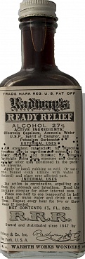 5 7/8” 1 7/8” x 7/8” rectangular bottle with black liquid and metal screw cap. High alcohol content. For internal and external use. The company operated until 1948.