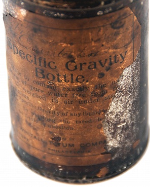 Description: 5.5×2.5d lacquered tin can with label Specific Gravity Bottle and Directions, can contain a funnel and a blown flask lablelled by hand engraving 15 degrees C, 1000 grains, WT and Co. There is a compartment in the lid 1×1.25“d which is empty. According to illustration in reference this contained a counterpoise weight.