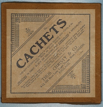 Description: 6” sq by 0.75” cardboard box with remnants of a few cachets and a lable for Warrick Bros cachets set of apparatus.