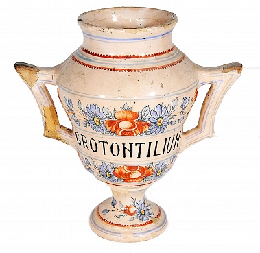 Description: 9“x 5.5“d earthenware pot, in good condition. Decorated with blue and orange flowers on a tan background. Labeled Grotontiliun. The jar has a raised base and two handles of irregular shape.