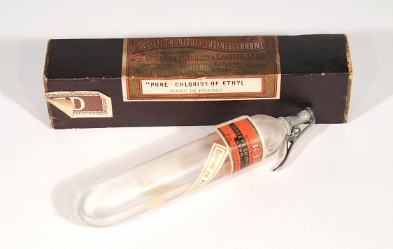 Description: 6.5“x 1.25“x 1.5” cardboard box with elaborate label contains glass vial with metal cap and spring release nozzle. Label on vial Kelene,Chlorure d’ethlye pur,Societe Chemique des usine du Rhone, Lyon, Le plaine, Suisse Anct. Gilliard, Monnet and Cartier. Patented in France and foreign.