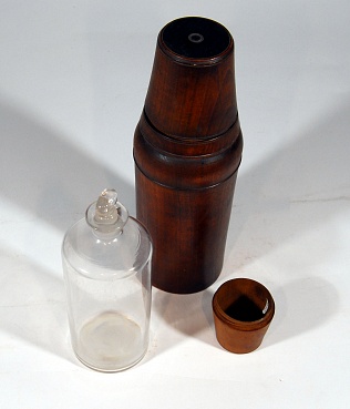 Description: 9“x 2.85” d wooden container. The top is shaped like a medicine glass and screws off to reveal a container shaped like a medicine glass, which used to contain a medicine glass. The second lid also unscrews to reveal a 6.5“x 2.25” d bottle with pontil.