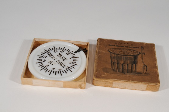 Description: 4“x4“x5/8” box with label as above and lithographed picture of a glass with cover and spoon and Patented Nov 17, 1896. 4” circular milk glass with lip to fit on a glass, metal fitting on edge can be moved to point to a time on the dial, which is etched and colored black to resemble a clock face. The pointer also can hold a spoon. Inside clock is engraving “Take Next Dose At”.