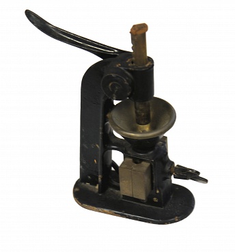 Description: Named the Whitall Tatum Suppository Machine No. 1. 6” high, contains a removable brass mold and a funnel into which material is placed. A lever action rod forces the material from the funnel into the mold which can then be removed and separated in two parts to remove the suppository.