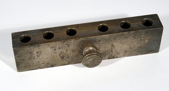 Description: 7.75“x 1.75“x 1” with two parts, which close with a screw device and which form 6 bullet shaped holes each 1/2” to form suppositories. Original nickle coating with brass showing in some areas where it has been worn. Size number 4.