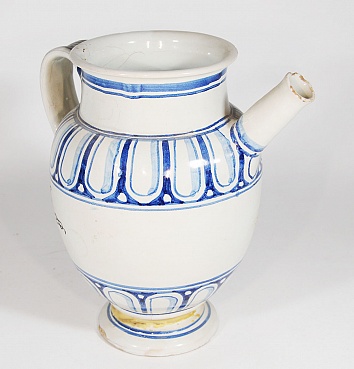 Description: 8.5×6” syrup pot, in good condition. Decorated with blue mock gadroons, probably an original from Savona in the Province of Liguria. Decoration is in dark and light blue. Labeled Ol. Went.