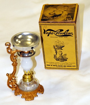 Description: 6.75“x 3.75“x 3.25” yellow cardboard box with picture of girl asleep and of lamp and directions for use. Contains directions to only use best kerosine lamp on ornate gilded base with extra wick and two chimneys, one clear glass the other opaque. Dish on top to hold the medication. The medication bottle is shown in one of the photos. It is a bottle with multiple ridges that were used to denote poison, not for internal consumption. The bottle measures 4: x 1.5 sq. It is embossed, not pontilled.