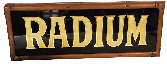 Description: 24“x 9” reverse painted sign with Radium spelled in gold letters on black background. The whole is framed with a copper frame and backed with wood and metal. Reported to be an outdoor sign.