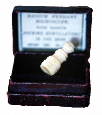 Description: A red box 1.5“x 1“x 0.5” embossed on top Radium Microscope, label on the bottom reads “Micro scintilloscope F. H Glew etc.” Label in lid Radium Pendant Microsope showing scintillations in the dark, patent Eng., Fr., USA. Contains a 0.75“x 0.25” ivory piece shaped like a chess pawn with a lens at head end and hollow with viewing plate at the base inside. The device is not shown here as it was lost at a loan exhibition But it is cited because some years ago I purchased a carton of instruments from the descendant of a Glasgow optician who had been interested in X-Rays. The carton was contaminated with radium. This spinthariscope was in the carton as well (Blaufox, MD, Constable AR: Antique Hazards: A Latter Day Encounter with Radium. J. Nucl. Med.24:79’82, 1983). Also contained in the carton was a vial of radium, shown here in a protective lead glass container and of radioactive shellac for for coating luminescent dials both of which were contained in a small wooden box in the carton . The entire story is discussed in detail in the article cited. On further surveying of the box, it turned out it contained some cotton-like material and two vials; on one that it contained about l7 pCi of activity. One vial was handwritten “Radio Varnish”, and on the other vial “Spirit of Turpentine”. The reverse side of both vials was labeled “F. H, Glew, Surgical Radiographer,Silver Medal (HighestAward, Paris 1900), 156 Clapham Road, London S.W.” Shown as noted in its protective lead glass that was prepared later. These rather innocuous-looking objects containing an unidentified clear fluid were of particularinterest,since in England the surgical radiographer was the rough equivalentof the radiological technicianin the United States. A small corked vial was retrieved from the box containing about three cm3 of a coursepink powder labeled “Radium Compound” “0.4 Admiralty Specification” “2 gr”.