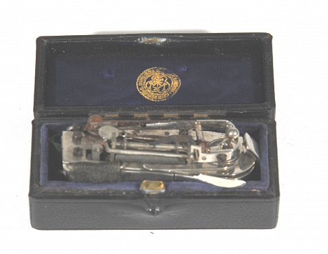 Description: 3.5” x 1.5” x 1.75” black paper covered box containing 2.5” x 3/4” x 3/4” metal sphymograph, which completely collapes into the box. The stylus can be activated by lifting a metal holder and pulling out a rod on the bottom. It is wound by turning a knob on the top and turned on with a lever.