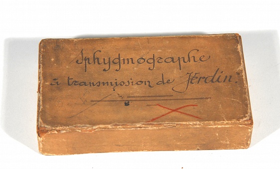 Description: 5.5”“ x 3” x 3” brown cardboard box with words “ Sphygmographe a transmission de verdin “ on cover. Brass device is 4.5” long with 2 1/8” tambour with side arm of nickle plated metal 0.75” to connect to rubber tubing. The side bars to hold to wrist with ribbon are also nickle. The bottom of the device is like the Marey sensor part with an ivory or bone tip to place on the artery.