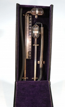 Description: Same device as in link except the container is 15×5×4” and stands on end. One side folds down to reveal the manometer while the space behind it in the box is used to house the cuff and the rubber pump when not in use. Complete.