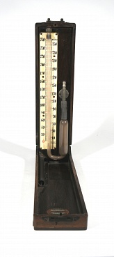 Description: Wooden box 12.5×3.25×1.75.” Lid springs open to reveal ivorine scale to 260 mmHg. Painted black leters, occasional red cross bars. Serial number 4282. Standard Baum constrction of the glass manometer.