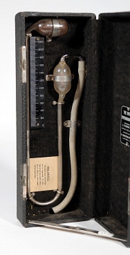 Description: Paper covered box 11×4×2. U-tube manometer with bulbous reservoir at top of end connecting to cuff and pump. Adjustable scale calibrated to 220 mmHg. The manometer is contained in the bottom of the box.
