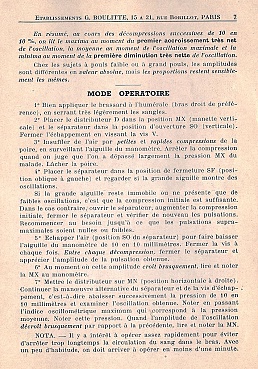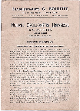 Description: 10×7×3” black box contains a 5×4.5 triangular shaped steel gauge with one scale from 0 to 20 for oscillations and the other 0 to 300 mmHg. Labeled Oscillometre de G. Boulitte. The gauge has outlets for the cuff, a switch to determine the minimum and maximum oscillation, and to switch from pulsations to pressure. The bulb is in the red cloth lined box, C00169 and the screwdriver is present.