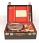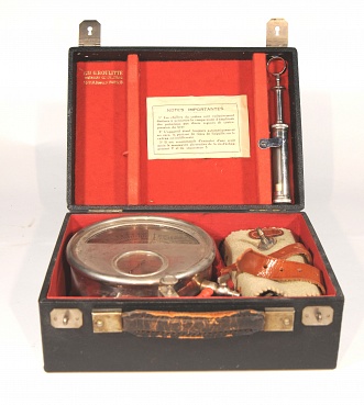 Description: 10“x 7“x 4” black box contains a 5.5“d x 3“h circular steel gauge with one scale from 0 to 20 for oscillations and the other 0 to 30 cmHg. labeled Oscillometre sphygmometrique de G. Boulitte. The guage has outlets for the cuff, a switch to determine the minimum and maximum oscillation, and to switch from pulsations to pressure. The red lined box contains the original pump of metal and glass.