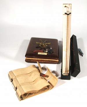 Description: 13” x 7” x 3” red leather lined box contains a finely embroidered cloth cuff, a pump made of two opposing pieces of cherry wood, connected by a bellows of the same material as the pump with an outlet to connect tubing and a screw to open and close the bellows. The manometer is in a separate box within the box. It is 10” with an ivorine scale, bulbous glass top and it has a level and folds out. Description in ref 28 in the bibliography calls this or one very similar the Surgman. In ref 31 another similar one is called the Wigmore, but the one in ref 28 is closer.
