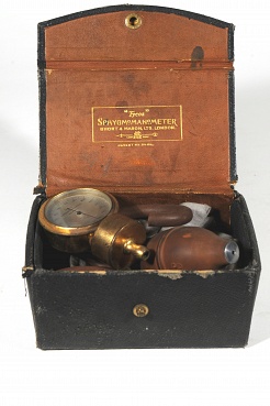 Description: 2” diameter dial with gilded case and patent number and serial number,9535 and 21477. In a leather case 5.5” x 3.5” x 2.5” with gilded embossing in lid. Box also has a rubber bulb, cloth cuff and tubing.