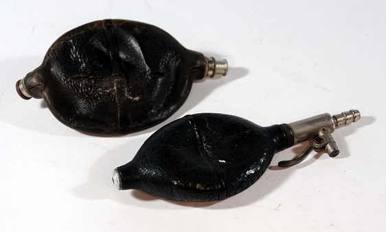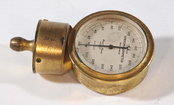 Description: 2” circular anaeroid scale, calibrated from 20 to 300 mmHg.Tycos Sphymomanometer on scale. The base has one tube to connect cuff and insufflater. There is a clip to attach to a cuff on the back. Gilded.